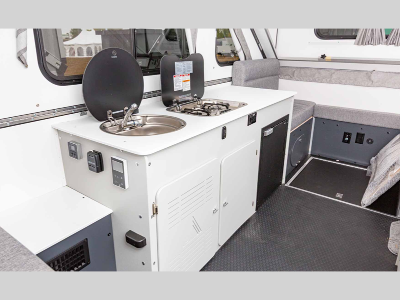 Sleeps 4 Length 15 ft Ext Width 6 ft 6 in Ext Height 5 ft 7 in Exterior Color Slate Gray Hitch Weight 210 lbs GVWR 3000 lbs Dry Weight 1965 lbs Fresh Water Capacity 11 gals Tire Size 15" Furnace BTU 18000 btu Refrigerator Type 12V Refrigerator Size 3.2 cu ft Cooktop Burners 2 Axle Count 1 Solar Wattage 200 watts -