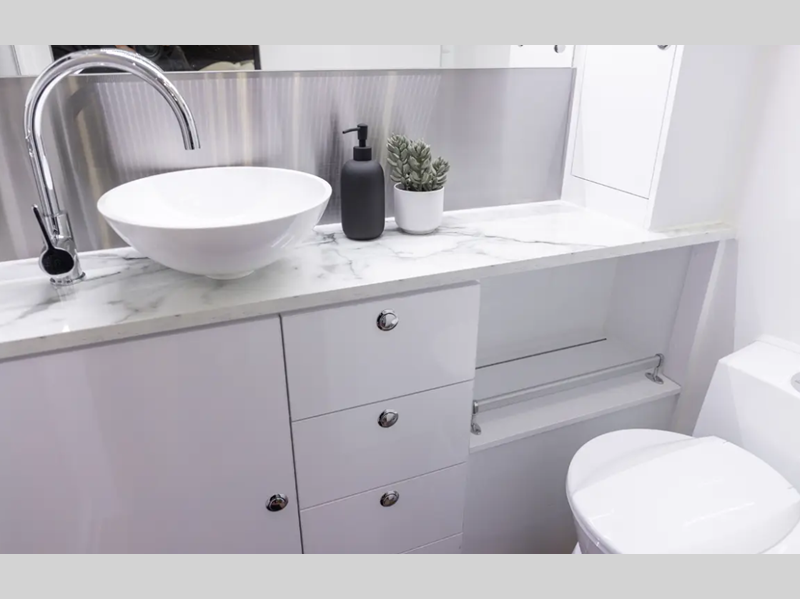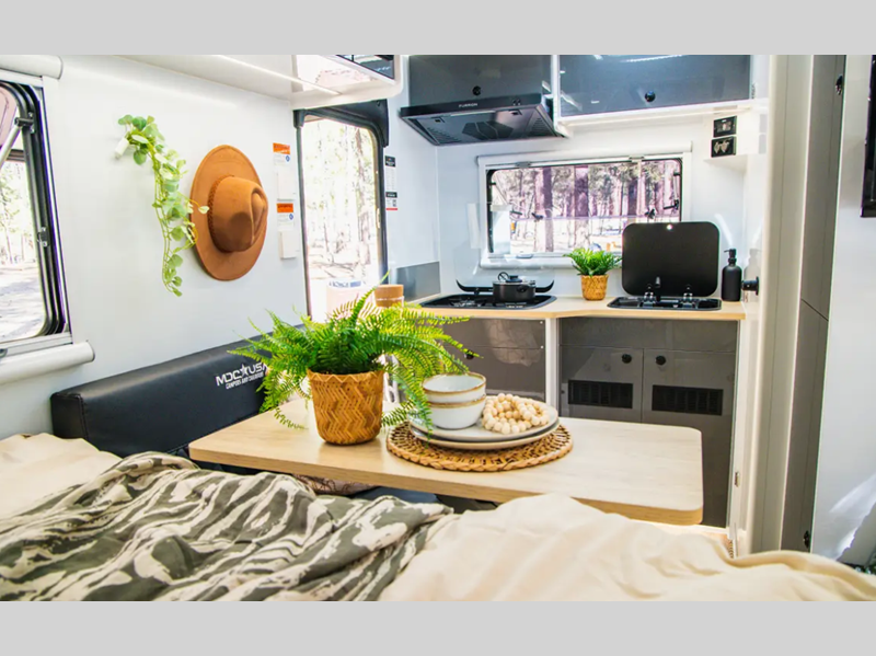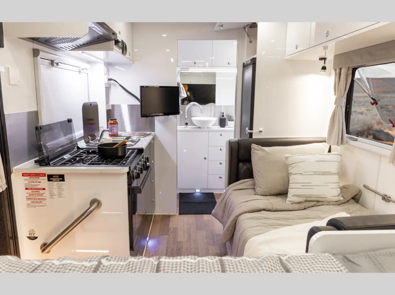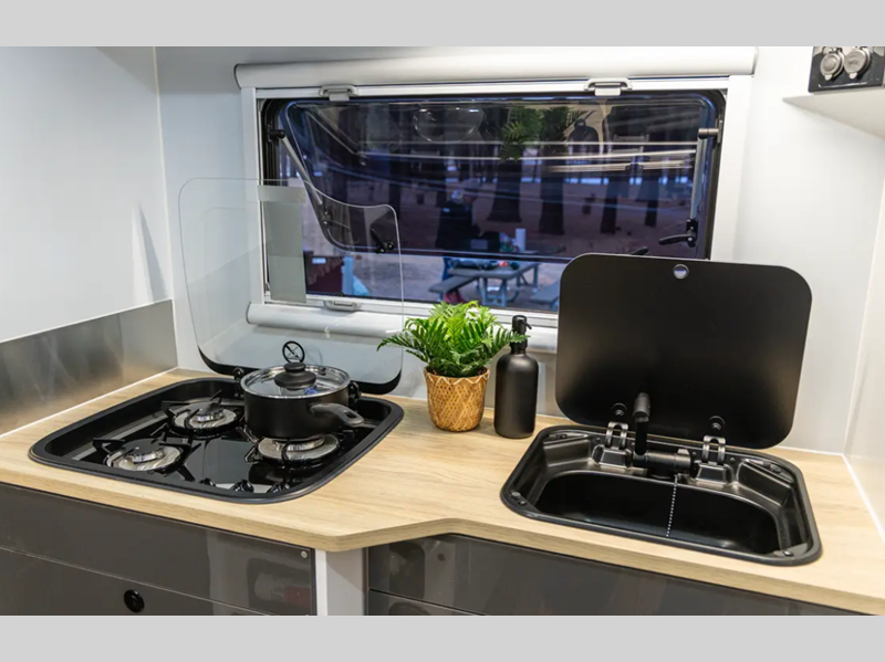 - Laminated benchtops with glass lid propane stove/convection oven combo & plumbed washboard sink and internal refrigerator (select models)