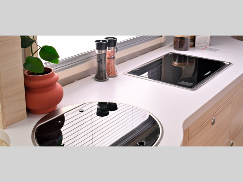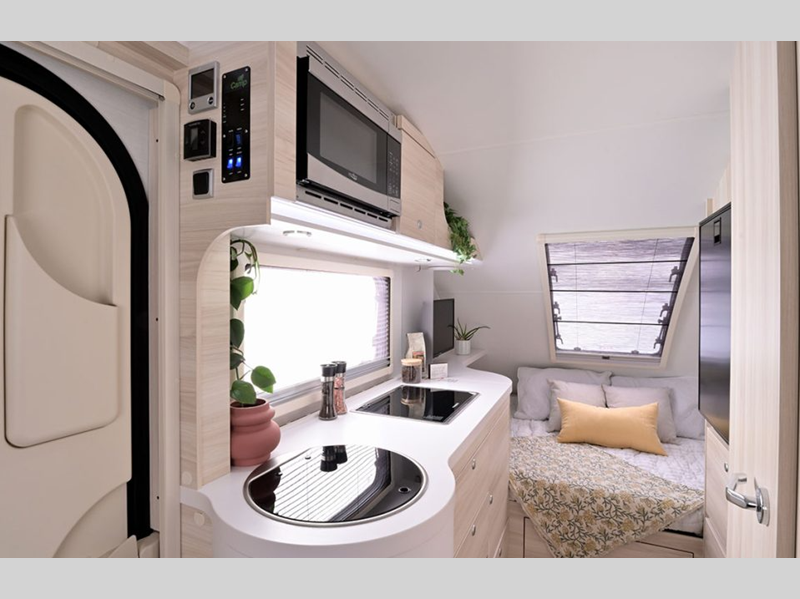 The TAB 400 is built with the unique teardrop design on a single axle, and includes composite flooring, molded underbelly shield, and a rear stargazer window allowing you to stargaze at night. There is a 310-watt solar panel included allowing you to camp off-grid, and the Alde central heating/hot water system plus the central air conditioning will keep you comfortable whichever season you camp. You will also love the interior that offers a spacious wet bath, dual sleeping areas, and kitchen amenities. The Boondock package comes standard, but you can also choose the optional Black Canyon Upgrade with an additional solar panel, holding tank heaters, underglow lights, and an XL diamond plate storage tub!